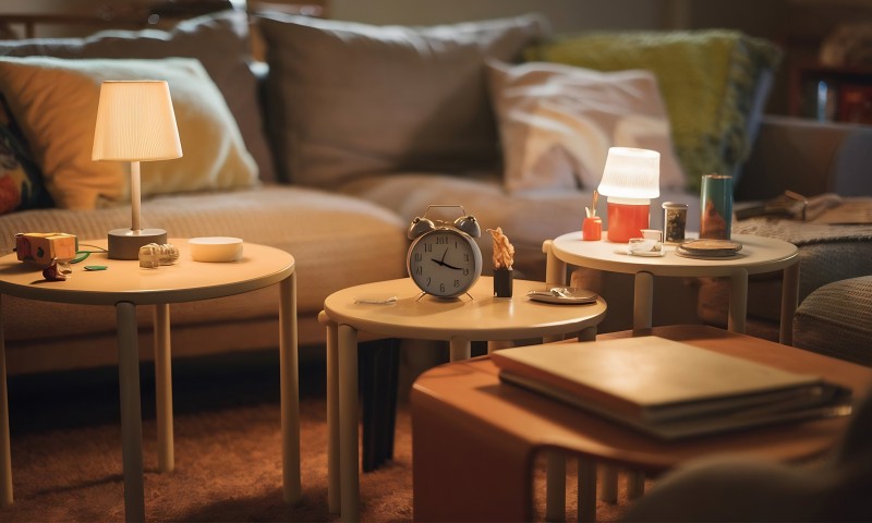 Зачем ограничиваться одним большим столом, когда можно использовать два или три маленьких? Легкие столики из стекла или металла не займут много места, зато обеспечат дополнительное пространство для книг, журналов и чашек с кофе.