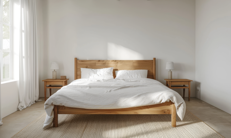 Спальня: Кровать с деревянным каркасом, белое постельное белье из хлопка, прикроватные тумбочки с минималистичным дизайном, светильники с теплым светом, картины с изображением природы.