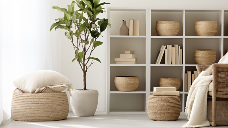 Гостиная: Светлые стены, диван с льняной обивкой, деревянный журнальный столик, ковер из натуральной шерсти, комнатные растения в плетеных корзинах.