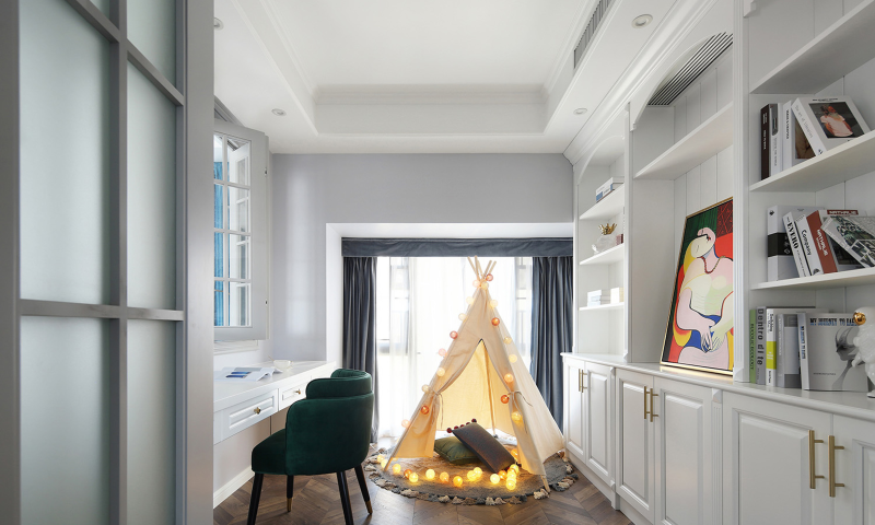 Мебель: Используйте мебель для разделения пространства. Например, стеллаж, шкаф или диван могут служить перегородкой между игровой и учебной зонами.