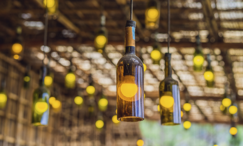 Пример: Сделайте оригинальный светильник из старой стеклянной бутылки, просверлив в ней отверстие и пропустив шнур с лампочкой.