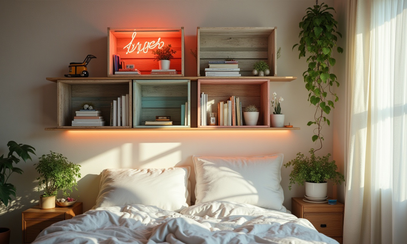 Сделайте полки из старых деревянных ящиков, покрасив их в разные цвета.