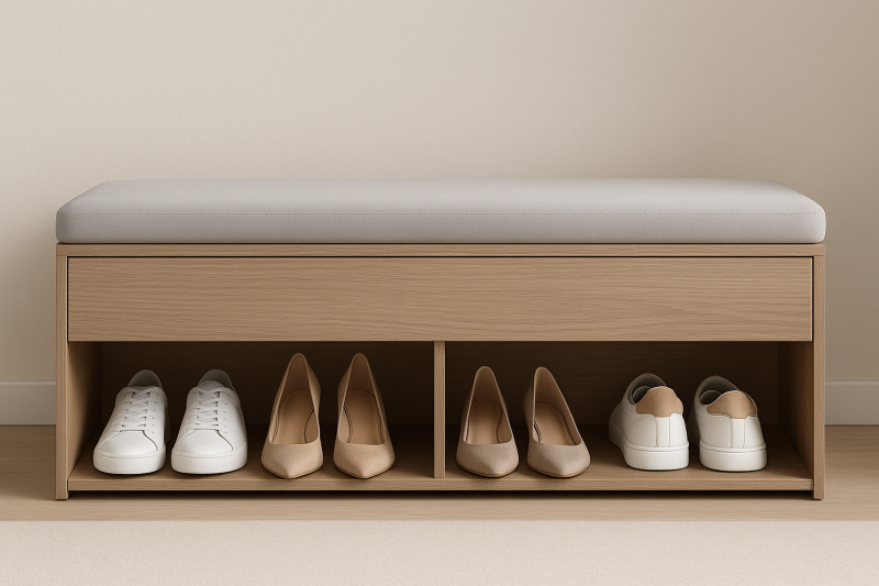 Если прихожая позволяет, рассмотрите высокий шкаф-купе. Такой шкаф легко вместит десятки пар, при этом встроенные выдвижные корзины и полки сделают хранение максимально удобным. Зеркальные фасады зрительно расширят узкое пространство, а комбинированная конструкция с вешалкой и верхней полкой станет настоящей мини-гардеробной. Для тех, кто ценит практичность и комфорт, идеальным решением станет лавка с отделениями. Под мягкой подушкой скрываются ящики — место найдётся и для детских тапочек, и для сезонных аксессуаров.