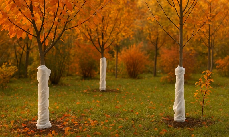Обматывайте стволы молодых деревьев специальным нетканым укрывным материалом, обеспечивающим воздухопроницаемость