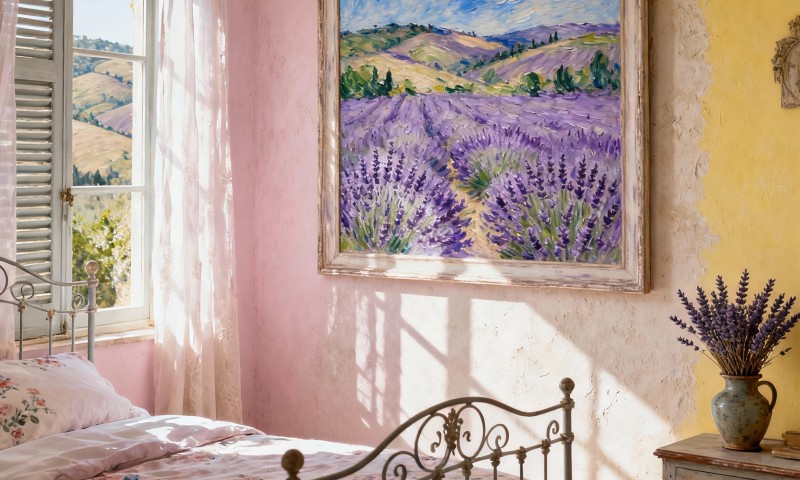 Прованс: Пейзажи с лавандовыми полями, натюрморты с фруктами и цветами, акварельные рисунки в пастельных тонах. Рамы – из дерева, окрашенные в светлые тона.